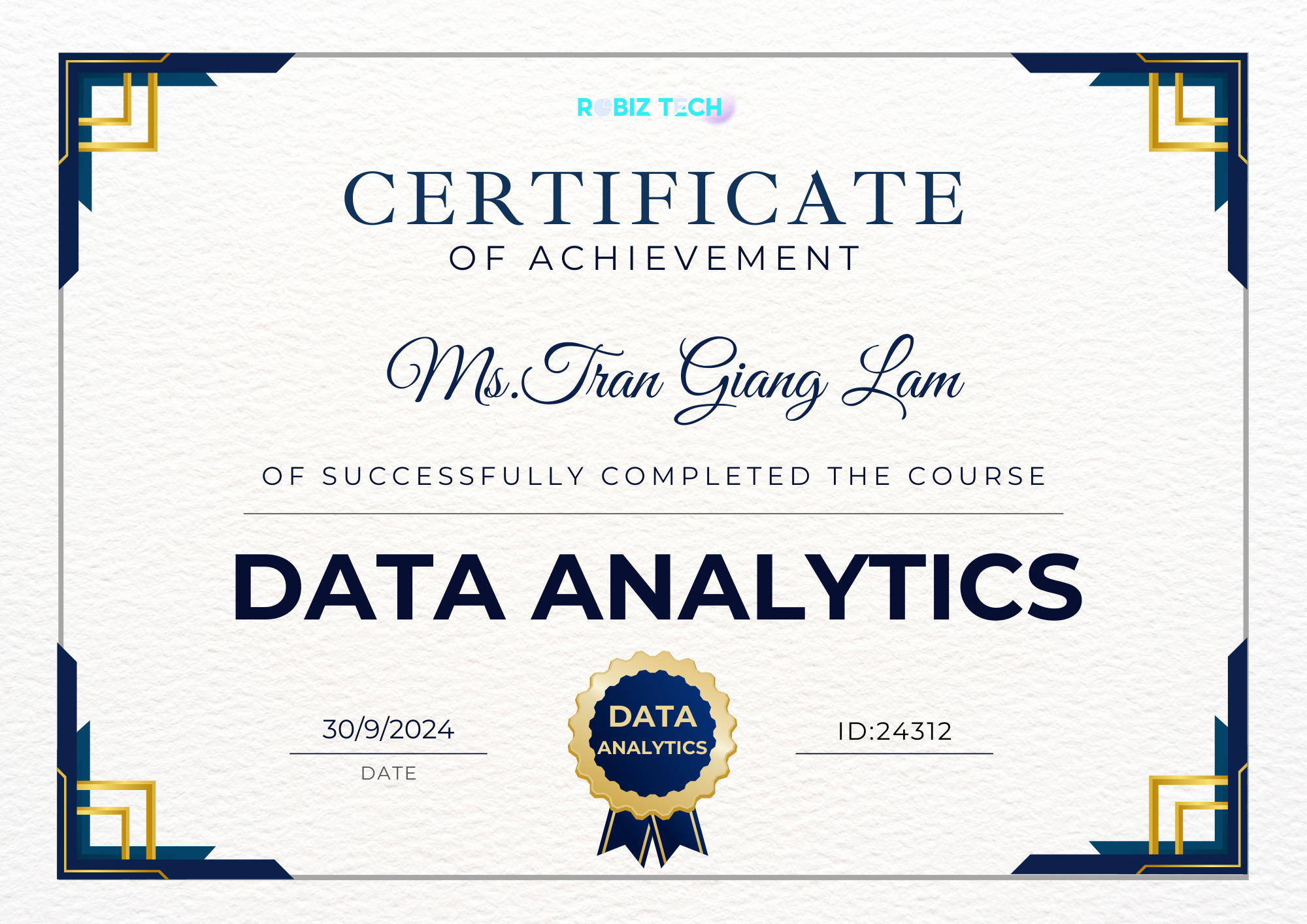 “Trải qua các khoá học chất lượng của Robiz Tech, học viên cảm thấy tự tin hơn khi được trang bị đầy đủ những kiến thức bổ ích về phân tích dữ liệu, đồng thời học hỏi được rất nhiều điều từ đội ngũ giáo viên tận tâm, chuyên nghiệp của trung tâm”
